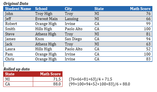 In the above example, we have rolled all the way up to obtain a single number, but in most cases, you may want to roll up only to a certain level such as computing the average Math score of high school students grouped by geographic state. In this case, the Math scores of the students of each state will be aggregated independently, and the result is a value for each state.