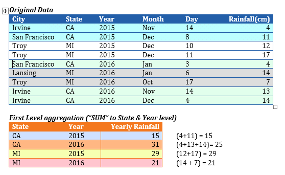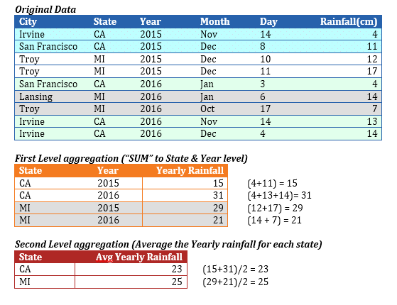 1. Roll up the rainfall data (by using SUM) at the 'State' and 'Year' level. Once we have this rolled up data, we further roll up the data (by applying AVERAGE) to obtain the average yearly rainfall of each state.