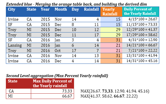 Let us look at more complex scenarios in the rainfall data set where the intermediate table is merged back with the original 'Fact' table. Assuming that you want to compute the maximum percentage of the yearly rainfall that any single day has received in each state, you must create a derived dimension whose formula is as follows: