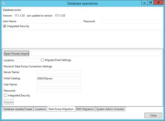Select the Integrated Security check box to use Windows Authentication. The specified user must have system administrator rights to update the database. |