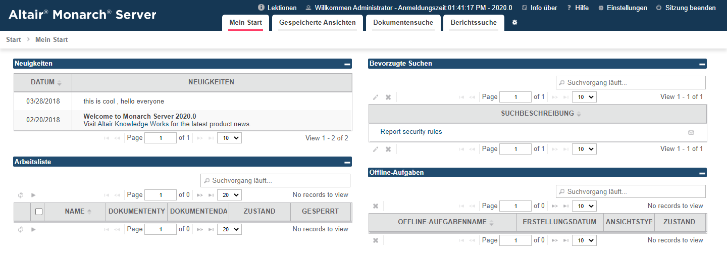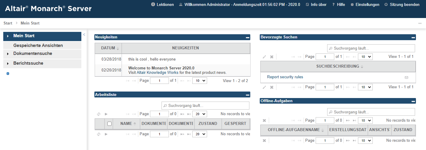 Baumstrukturbasiert – Durch dieses Schnittstellenformat wird die MSClient-Schnittstelle vertikal in zwei Bereiche unterteilt. Der linke Bereich enthält die Navigationsstruktur, durch die die verschiedenen Anwendungsabschnitte verknüpft sind. Der rechte Bereich zeigt dagegen die Seite an, die dem ausgewählten Abschnitt entspricht.