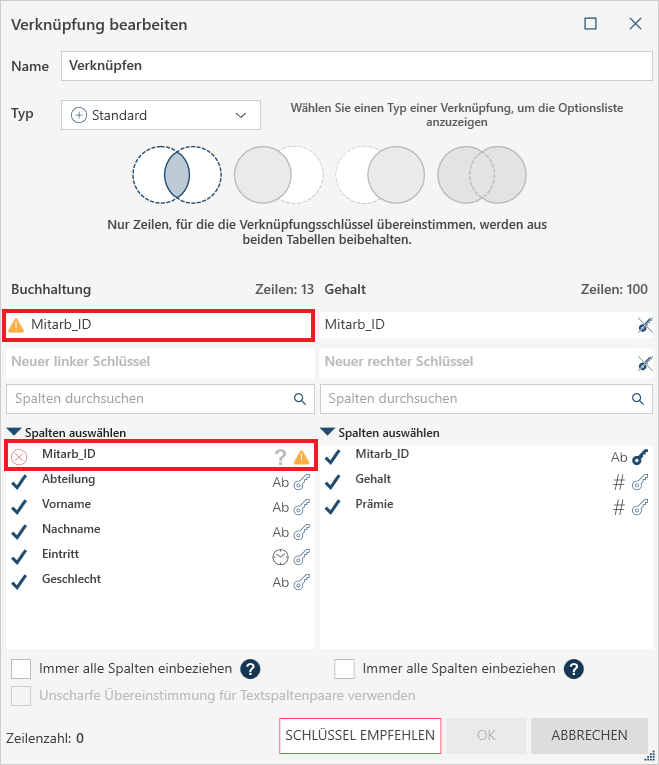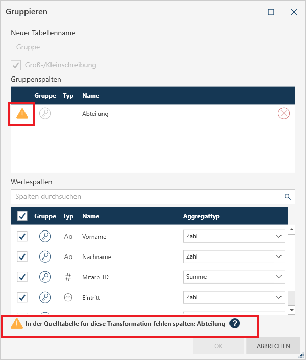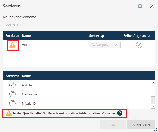Ähnliche Warnhinweise werden auch für alle anderen Transformationen angezeigt. Sie müssen das jeweilige Problem beheben, indem Sie die Transformation bearbeiten.