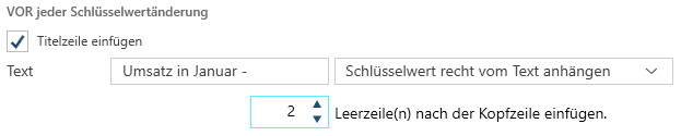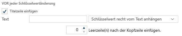 Gehen Sie auf der Registerkarte Layout zum Abschnitt VOR jeder Schlüsselwertänderung, markieren Sie das Kästchen Kopfzeile einfügen und legen Sie dann einen numerischen Wert für Nach der Kopfzeile n leere Zeile(n) einfügen fest, um die Anzahl der nach der Kopfzeile hinzuzufügenden Leerzeilen anzugeben.
