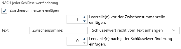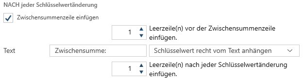 Gehen Sie auf der Registerkarte Layout zum Abschnitt NACH jeder Schlüsselwertänderung, stellen sie sicher, dass das Kästchen Zwischensummenzeile einfügen markiert ist, und legen Sie dann einen numerischen Wert für Vor der Zwischensummenzeile n leere Zeile einfügen fest, um die Anzahl der vor der Zwischensummenzeile hinzuzufügenden Leerzeilen anzugeben.