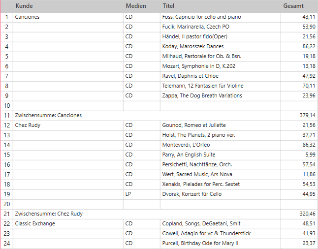 Sie können zu einer Summierung Leerzeilen hinzufügen, um logische Informationsgruppen voneinander zu trennen. Die Leerzeilen werden jedesmal dann hinzugefügt, wenn sich der Wert im ausgewählten Schlüsselfeld ändert. In der nachfolgenden Abbildung werden Leerzeilen hinzugefügt, sobald sich der Wert für das Feld „Name des Kunden“ ändert.