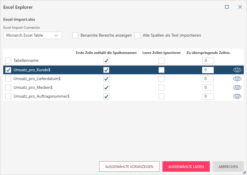 Wählen Sie einen Tabellennamen aus der linken Spalte des Dialogfeldes aus, um diese Spezifikationen anzuwenden. Wenn alle Tabellen in der Excel-Datei geöffnet werden sollen, markieren Sie das Kästchen Tabellenname. Anschließend können Sie die Kästchen für jede der oben beschriebenen Optionen für jede Tabelle einzeln markieren. Wenn Sie eine Tabelle vor dem Laden in der Vorschau anzeigen möchten, klicken Sie auf das Vorschausymbol ganz rechts vom Namen der jeweiligen Tabelle.