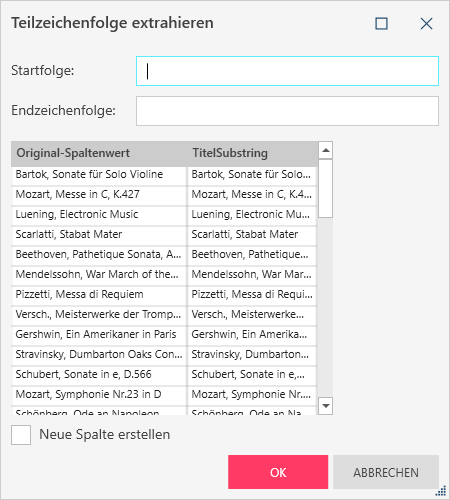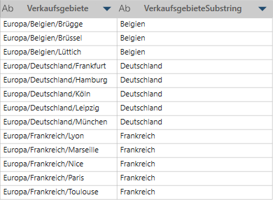 In diesem Beispiel ist die erste Spalte (Verkaufsgebiete) die Originalspalte. Wir extrahieren zwischen den Zeichenfolgen <Text> / und / <Text> und enden mit der Zeichenfolge VerkaufsgebieteSubstring.