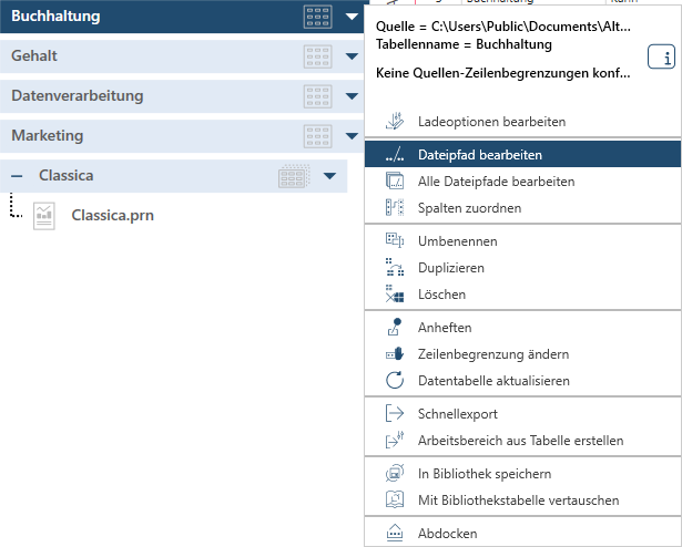 Klicken Sie im Fenster Vorbereiten auf den Dropdown-Pfeil neben der betreffenden Tabelle und wählen Sie dann Dateipfad bearbeiten aus.