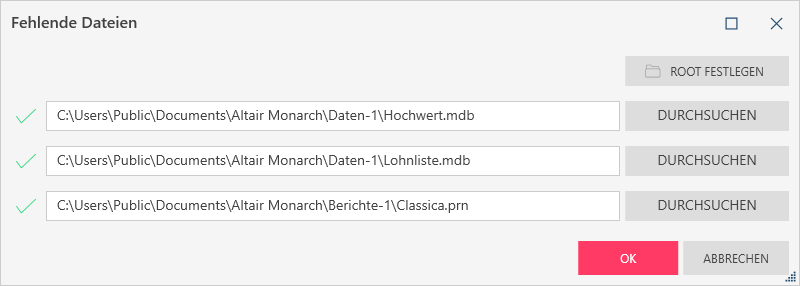 Klicken Sie in diesem Dialogfeld auf Durchsuchen, um das Dialogfeld „Öffnen“ aufzurufen und die Eingabequellen zu finden, durch die ihre Tabellen ersetzt werden sollen. Sie können auch einen Root-Ordner anlegen, von dem aus die Ersatz-Dateiquellen abgerufen werden können. Klicken Sie hierzu auf Root festlegen.