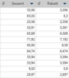 In diesem Beispiel ist die erste Spalte (Betrag) die Originalspalte. Rabatt ist ein Berechnungsfeld, das 10 % Rabatt anzeigt. Folgende einfache Formel wird hierzu verwendet: Betrag* 0,10: