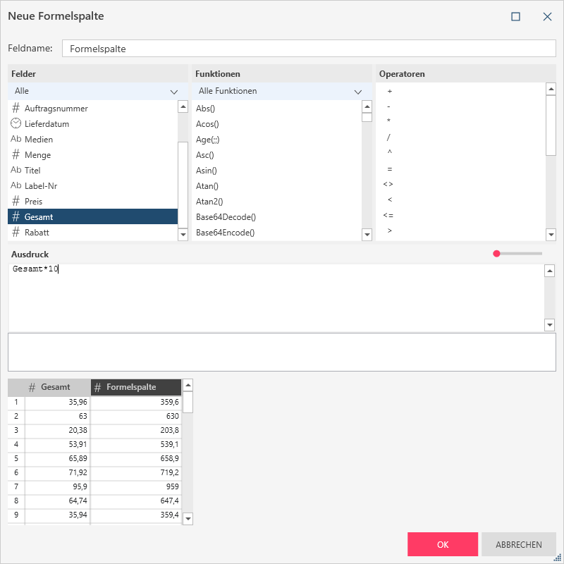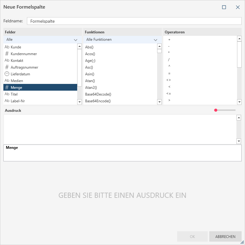 Wählen Sie Felder, Operatoren und Funktionen aus der Liste über dem Ausdruckersteller aus.
