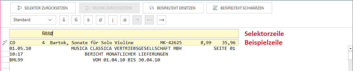Die „Beispiel“-Textzeile und die „Selektorzeile“. Die Selektorzeile enthält einen definierten numerischen Selektor.
