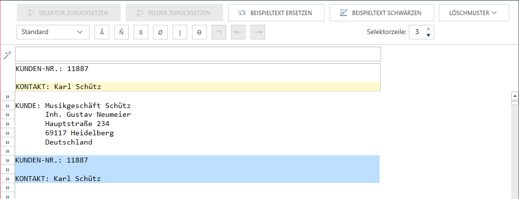 In einigen Berichten befinden sich die Detailfelder auf mehreren Zeilen, d. h. in einem Textblock. Es kann jedoch auch sein, dass die erste Zeile eines Textblocks nicht durch eindeutige Eigenschaften markiert ist.. Wenn Zeile 1 nicht verwendet werden kann, können Sie eine andere Zeile mit eindeutigen Eigenschaften angeben. In diesem Fall muss im Feld Selektorzeile die Beispielzeile angegeben werden, auf deren Basis die Selektion ausgeführt werden soll.