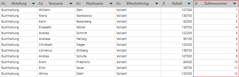 Klicken Sie mit der rechten Maustaste auf eine Spalte und wählen Sie dann Spalte > Neue Zeilennummerspalte aus. Die neue Spalte wird am Ende der Tabelle automatisch erstellt. Sie können diese Spalte beliebig verschieben. Zu beachten: Wenn diese neue Zeilennummerspalte bearbeitet wird, ist die tatsächliche Funktion, mit der die Zeilennummern erstellt werden, Recno. Dies ist ein bekanntes Problem.
