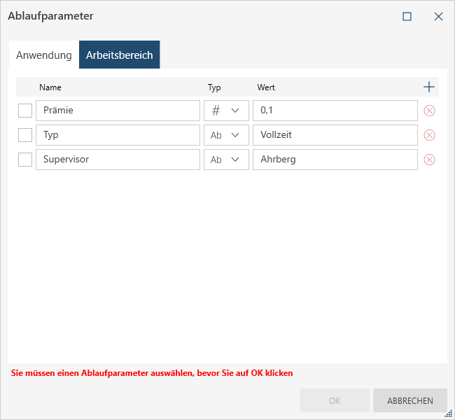 Das Dialogfeld Ablaufparameter wird angezeigt.