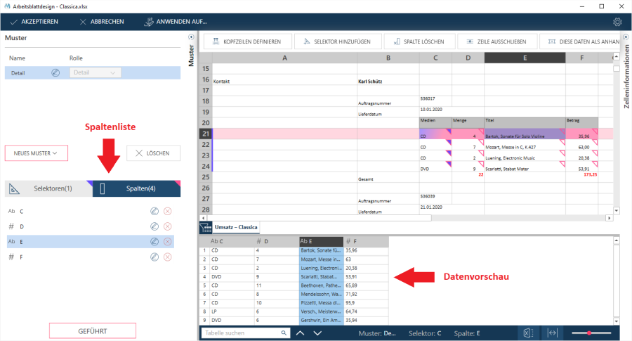 .Beim Hinzufügen von Spalten wird die Spaltendefinition der Spaltenliste hinzugefügt und die Beispieldaten werden in der Vorschautabelle angezeigt: