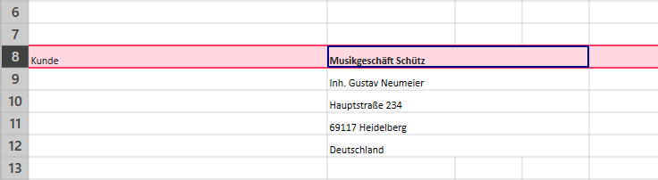 Manchmal müssen Spaltenwerte aufgenommen werden, die sich über mehrere Zellen erstrecken, wie beispielsweise die Adresse auf diesem Arbeitsblatt: