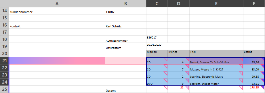 Arbeitsblattentwurf ermöglicht das Selektieren mehrerer Spalten in mehreren Zeilen. Im Beispiel unten definieren wir einen Bereich und selektieren nur eine Zelle.