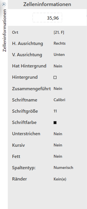 Im Fensterbereich „Zelleninformationen“ rechts im Fenster Arbeitsblattentwurf werden die Zelleneigenschaften angezeigt. Dort können auch die Selektoren verfeinert werden:
