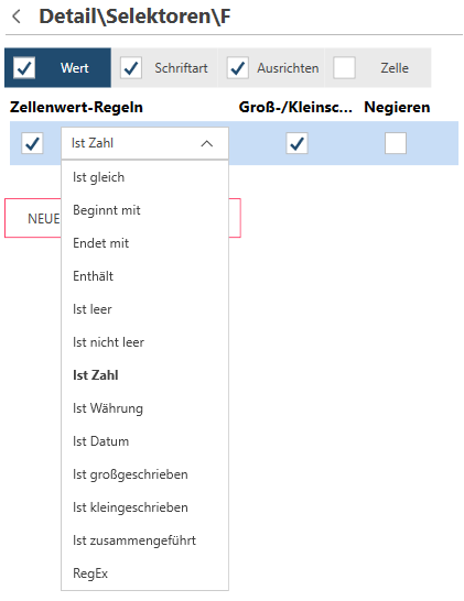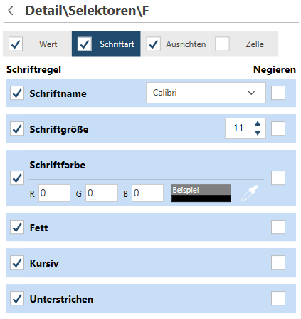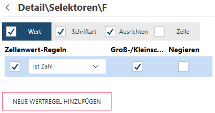 Wählen Sie die Registerkarten Schriftart, Ausrichten oder Zelle aus, um die Schriftart-, Ausrichtung- oder Zellenformat-Selektionsregeln zu bearbeiten.