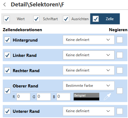 Die Registerkarte Zelle dient zum Definieren von Selektoren gemäß den Zellendekoration-Eigenschaften.