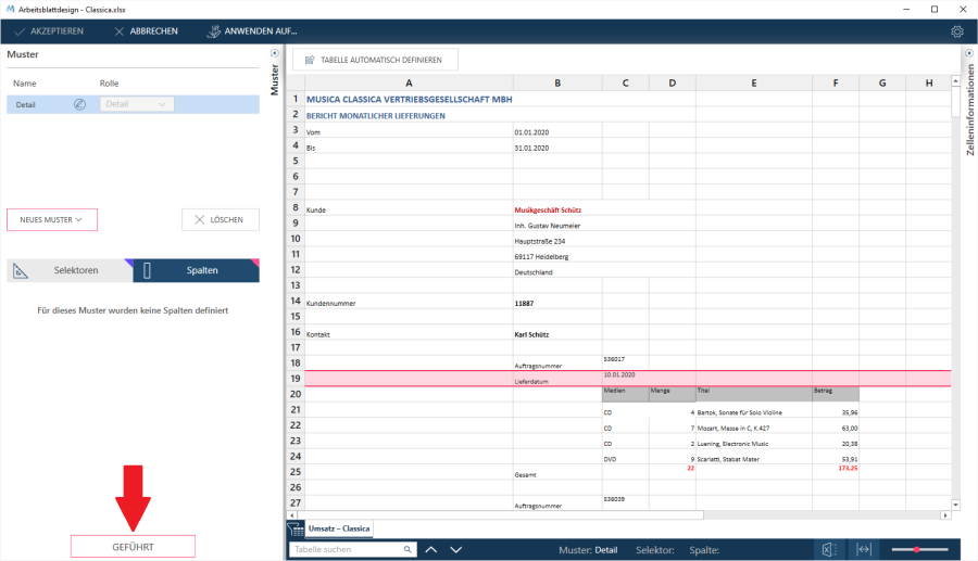Es ist zu beachten, dass der Assistent in diesem Schritt die erste wichtige Anforderung beim Erstellen von Mustern unterstützt: Das Detailmuster zuerst zu definieren.