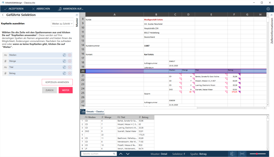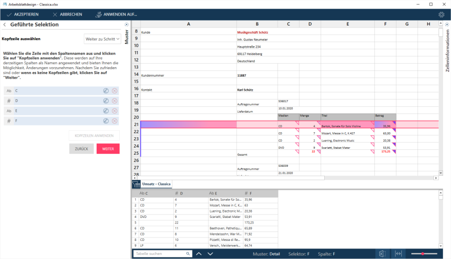 Wenn Sie Kopfzeilen ausgewählt haben, werden diese angewendet. Sie werden in der Vorschautabelle sowie in der Liste der Selektoren wiedergegeben: