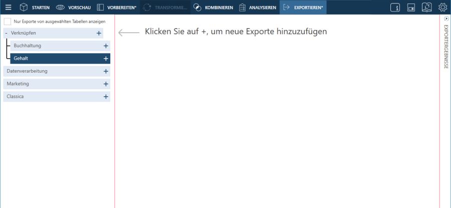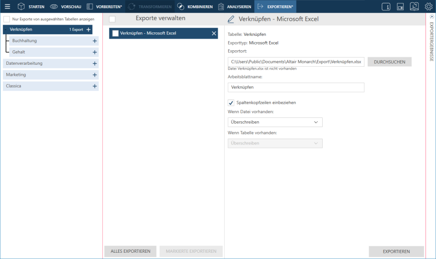 Sie können einzelne oder mehrere Tabellen exportieren, nachdem Sie diese kombiniert und transformiert haben.