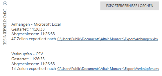 Um die Exportergebnisse anzuzeigen, klicken Sie auf den Export-Link im Fensterbereich Exportergebnisse. Hierdurch wird der angegebene Pfad kopiert und Sie können ihn mit der Maus in den Datei-Explorer eingeben, um zum Speicherort der Datei zu gehen.