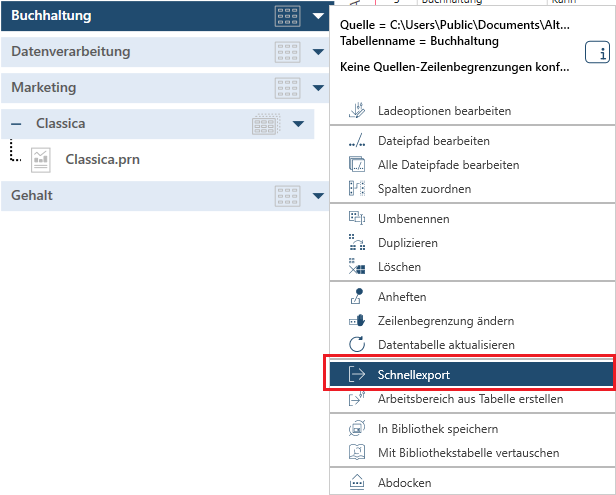 Schnellexporte – Diese Exporte werden im Fenster „Vorbereiten“ über das Kontextmenü der Tabellenliste oder durch einen Rechtsklick auf eine Tabelle im Fenster „Export“ eingerichtet. Schnellexporte werden nicht mit dem Arbeitsbereich gespeichert.