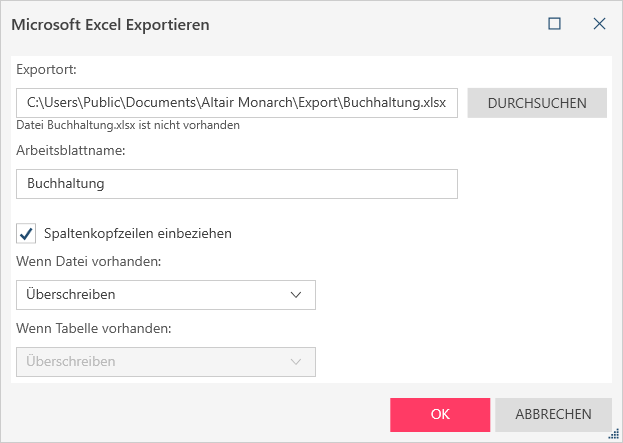 Wenn Sie „Überschreiben“ nicht auswählen, und die Datei bereits existiert, werden Sie in einer Mitteilung darauf hingewiesen, dass der Exportprozess übersprungen wird.