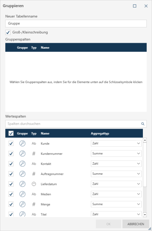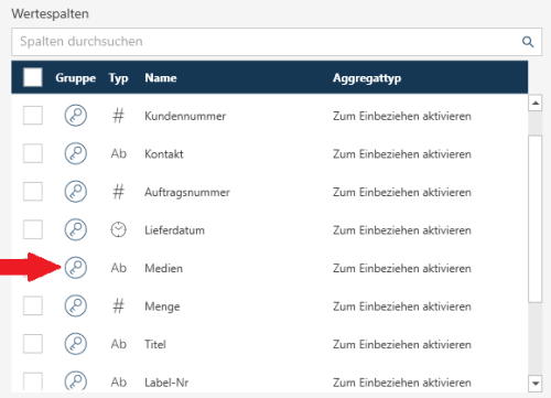 Wählen Sie die zu gruppierenden Spalten aus, indem Sie auf das Schlüssel-Symbol neben einer Spalte im Bereich Wertespalten des Dialogfelds klicken: