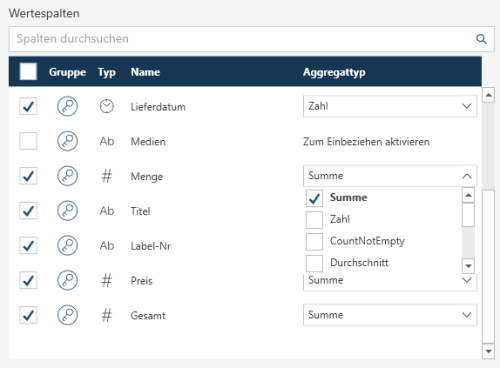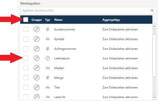 Wenn Sie bestimmte Spalten zur Verwendung als Werte auswählen möchten, markieren Sie das Kontrollkästchen neben der betreffenden Spalte.