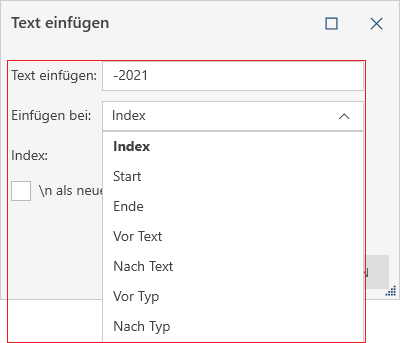 Index – Fügt die Zeichenfolge an einer bestimmten Stelle (Index) ein, beginnend links von den Werten im Feld. Wenn diese Option ausgewählt wird, muss auch ein Index (Index, d. h., die Anzahl der Stellen vom linken Rand des Felds) angegeben werden. Beispiel: Wenn das Feld den Wert ABCDEF enthält und Sie die Zeichenfolge -2000- einfügen möchten, indem Sie „Einfügen bei Index“ und einen Indexwert 2 angeben, ist der resultierende Feldwert A-2000-BCDEF. Zu beachten: Wenn der angegebene Index größer als die Länge des Wertes ist, wird der Text am Ende der Feldwert-Zeichenkette eingefügt.