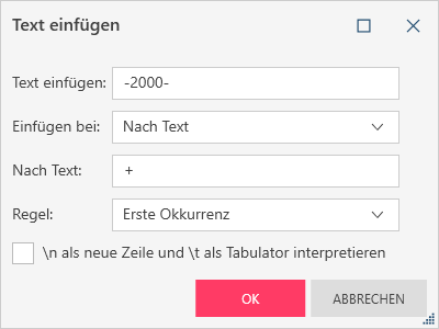 Vor Text – Fügt die Zeichenfolge vor einer angegebenen Textzeichenfolge (Vor Text) ein. Wenn diese Option ausgewählt ist, können Sie auch angeben, bei welcher Instanz (Regel, d. h., erste, letzte, jede) der angegebenen Zeichenfolge Text eingefügt werden soll. Beispiel: Wenn das Feld den Wert AB+CD+EF enthält und Sie die Zeichenfolge -2000- einfügen möchten, indem Sie "Einfügen vor Text", "Vor Text +" und "Regel Erste Instanz" angeben, ist der resultierende Feldwert AB-2000-+CD+EF.