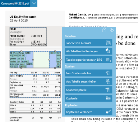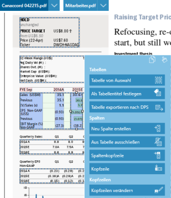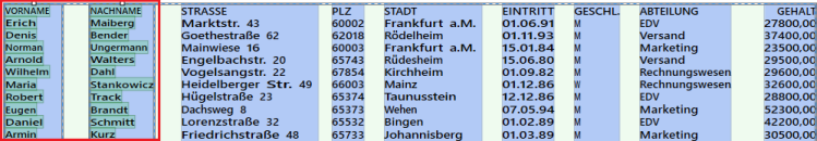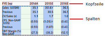 Der ausgewählte Text wird in den Spaltenkopfzeilen erkannt und als solcher im Tabellenfensterbereich angezeigt.