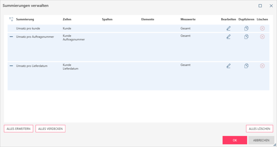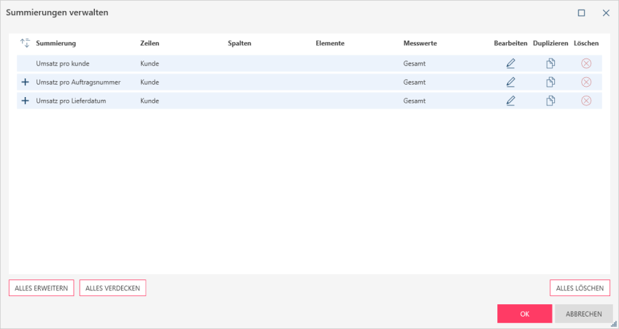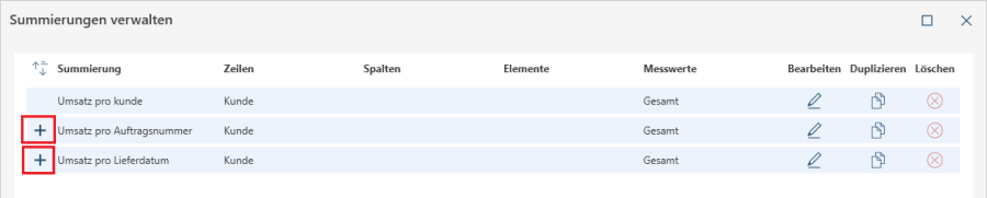 Die erstellten Summierungen erscheinen als einzelne Zeilen im Dialogfeld. Falls eine Summierung mehr als eine Zeile, ein Element oder einen Messwert enthält, klicken Sie auf