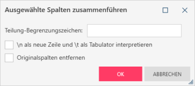 Wenn eine Spalte nicht mehr Teil der Zusammenführung sein soll, kann sie durch Klicken auf das Löschen-Symbol auf ihrer rechten Seite aus dem Fensterbereich Spalten zusammenführen entfernt werden.