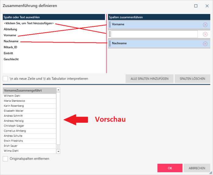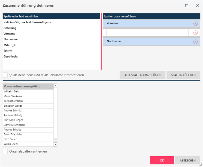 Spalten mit Hilfe des Dialogfeldes „Zusammenführung definieren“ zusammenführen