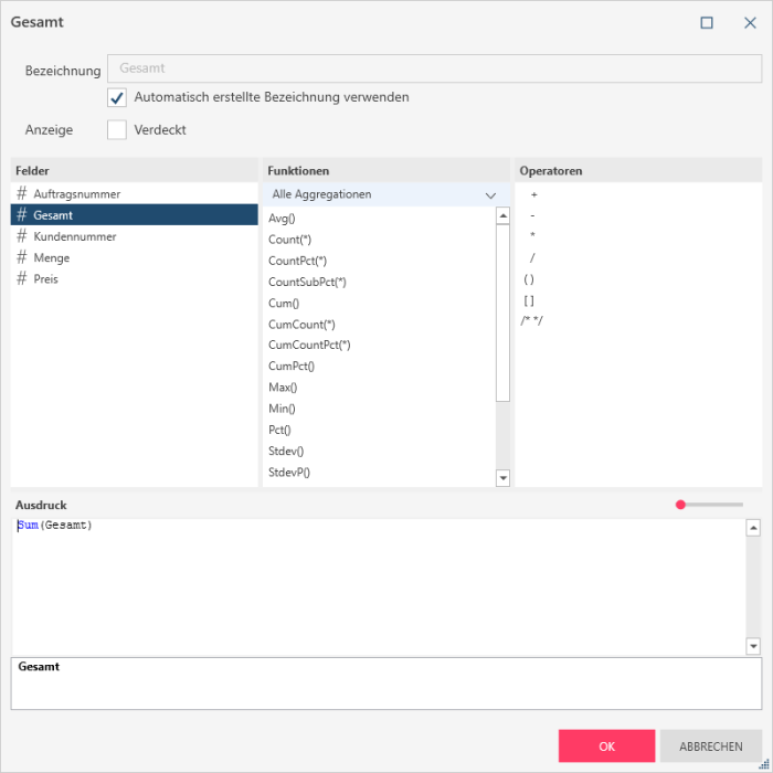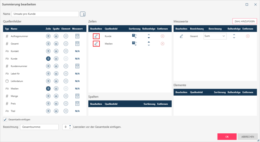 Beachten Sie bitte, dass das Ändern von Feldnamen in der Summierungsanzeige tatsächlich lediglich eine Änderung der Titel bewirkt. Im Dialogfeld Hinzufügen/Bearbeiten werden weiterhin die Originalnamen der Quellenfelder verwendet, nur die Summierungsanzeige zeigt die geänderten Titel an.