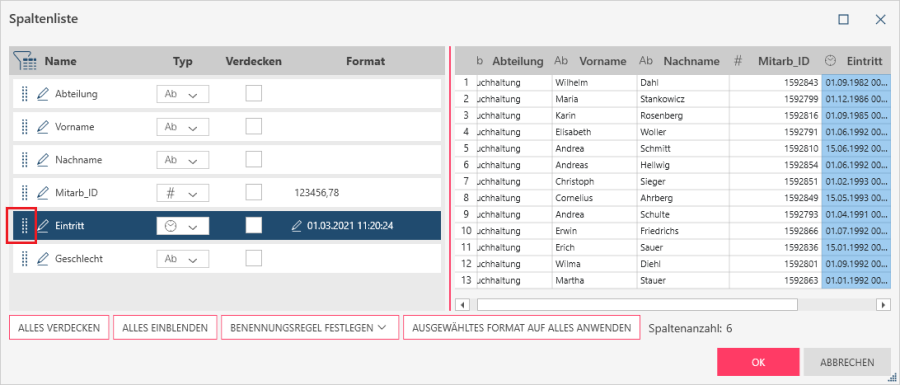 Ziehen Sie die Spalten in ihre neuen Positionen. Der blaue Pfeil ist Ihnen beim Positionieren der Spalten behilflich.