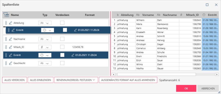 Eine Spalte mit dem Dialogfeld „Spaltenliste“ verschieben
