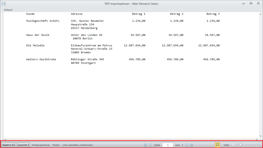 Ziehen Sie den Schieber unten im Fenster „PDF/XPS-Importoptionen“ nach rechts oder links, um die Musterdaten vergrößert oder verkleinert anzuzeigen: |