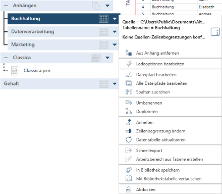 Beachten Sie, dass die verfügbaren Aktionen von der Art der gewählten Tabelle abhängig sind.