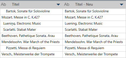 In diesem Beispiel ist Titel die ursprüngliche Spalte und Titel – Neu zeigt die neue Beschreibung ohne vor- und nachgestellte Leerzeichen.