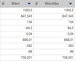 In diesem Beispiel ist die erste Spalte (Wert) die Originalspalte. WertAbs zeigt die absoluten Werte von Betrag: