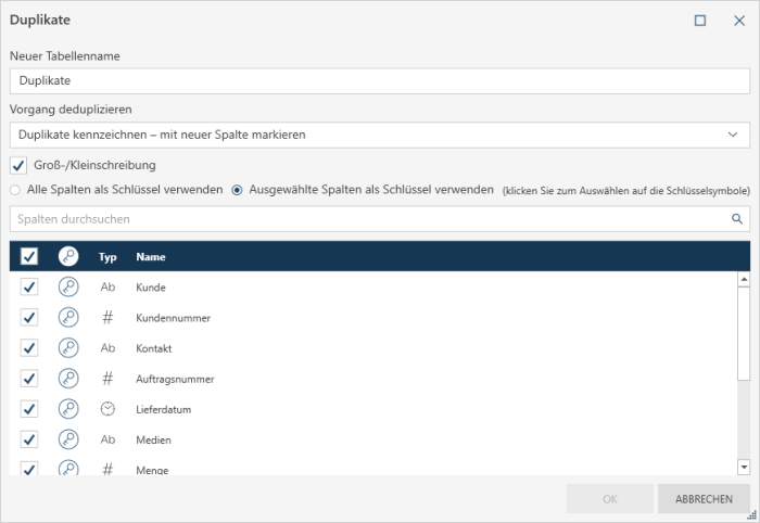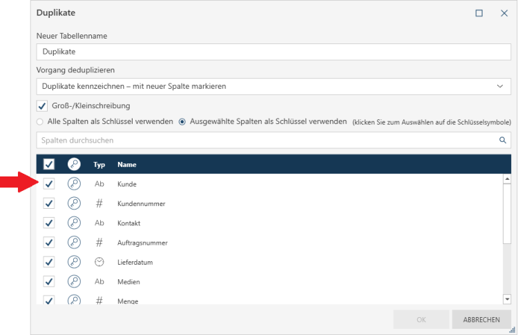 Sie können wählen, welche Spalten bei der Suche nach Duplikaten berücksichtigt werden und welche nicht.