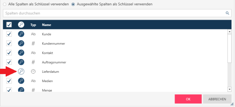 Wählen Sie die Spalten aus, die in die Ergebnistabelle mit einbezogen werden sollen.