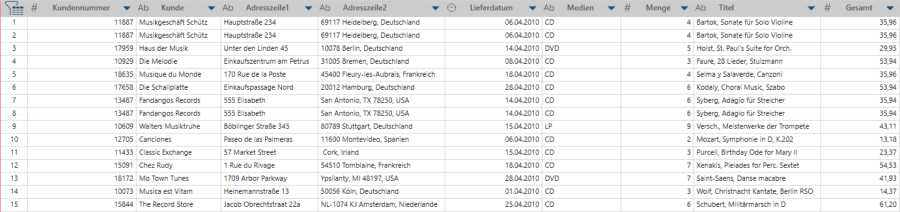 Es gibt zwei Gruppen von Duplikaten: Musikgeschäft Schütz kommt zwei mal vor und Die Melodie drei mal.