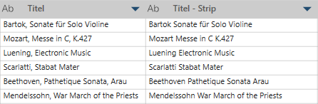 In diesem Beispiel ist Titel die Originalspalte. Der Vorgang „Angegebene Zeichen entfernen“ wird zum Entfernen des Bindestrichs verwendet, um die Ergebnisse in der Spalte Titel – Strip zu erzielen.